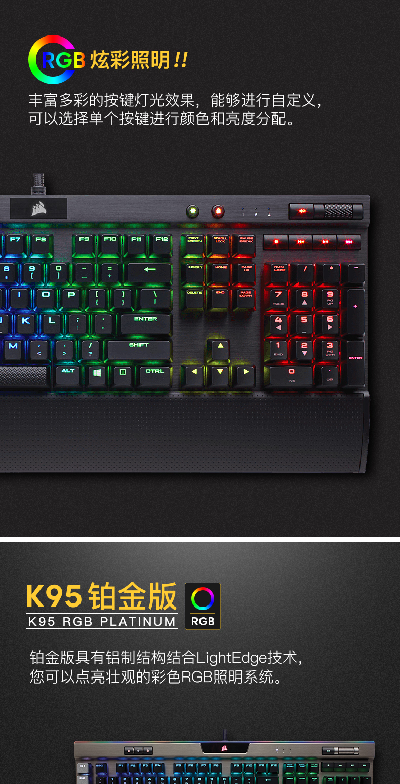 • 美商海盗船K70K68K95RGB铂金版惩戒者红茶青银轴樱桃游戏机械键盘